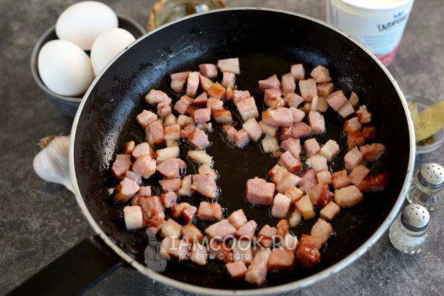 Параллельно поставьте обжариваться нарезанный копченый бекон (грудинку) и колбасу.