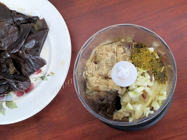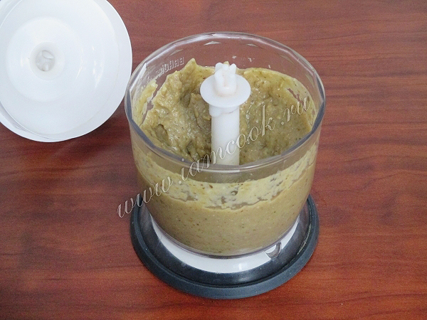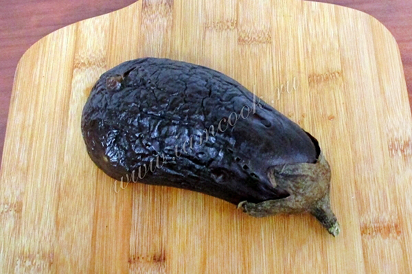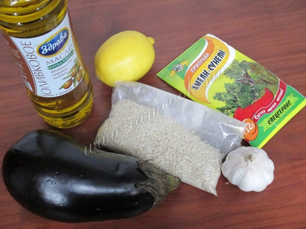 С остывшего баклажана снимите кожицу, а мякоть измельчите в пюре с кунжутной пастой (измельченными семенами кунжута или кунжутной мукой), чесноком, травами и специями. Добавьте оливковое масло, лимонный сок и соль.