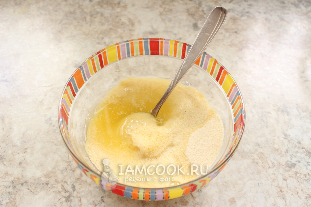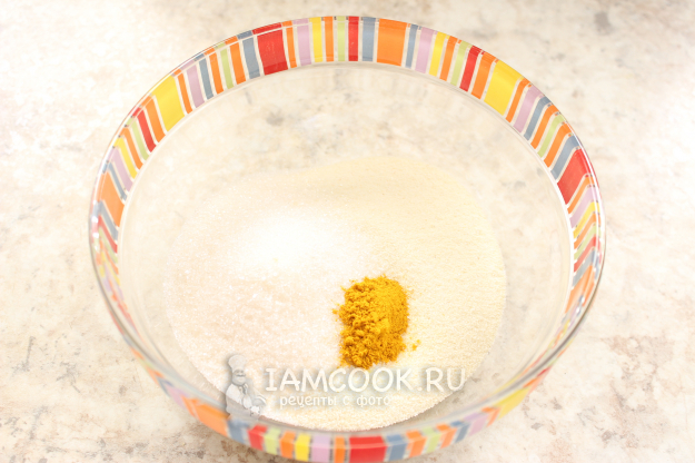 Берем небольшую миску, соединяем половину манки, сахар, добавляем куркуму и щепотку соли.