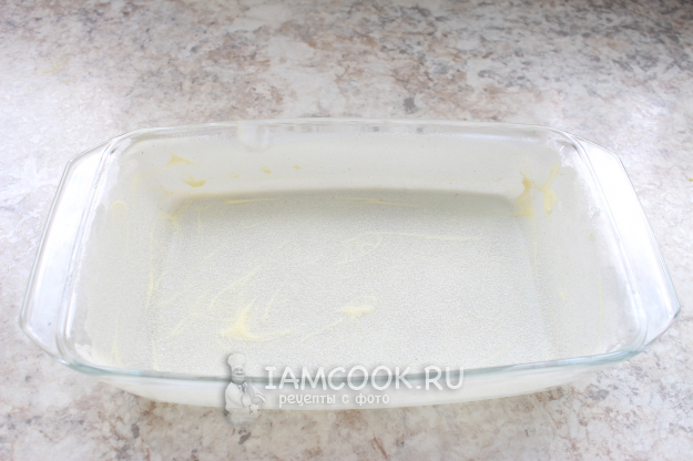 Форму для выпекания смажем сливочным маслом, обсыпаем манной крупой, так наша запеканка легче выйдет из формы.