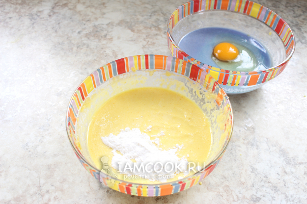 Перемешиваем, добавляем крахмал и разрыхлитель теста.