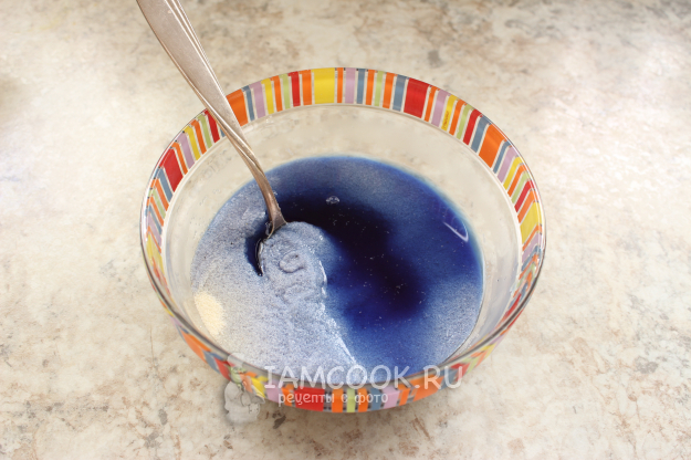 Заливаем вторую часть сухой манки с сахаром синим чаем. Цвет очень красивый, но он превратится потом в зеленый.