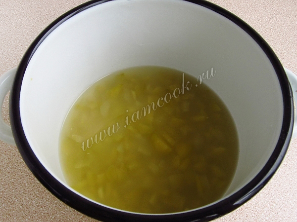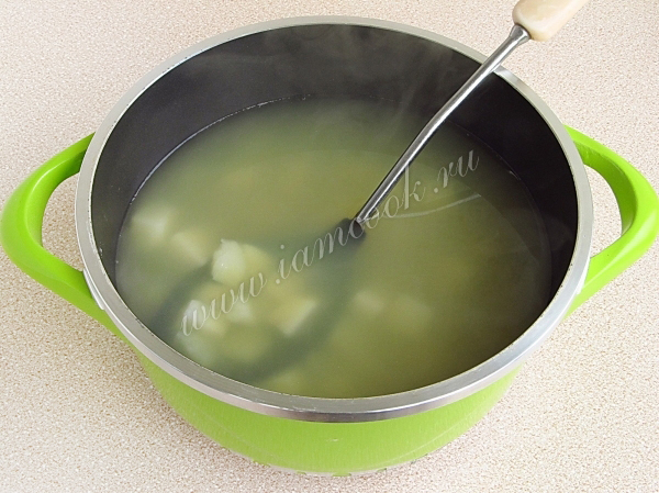 Залить картофель небольшим количеством кипятка и отварить до полумягкости. Ни в коем случае не класть картофель сразу в мясной бульон, так как кислинка от огурцов может сделать его твердым!