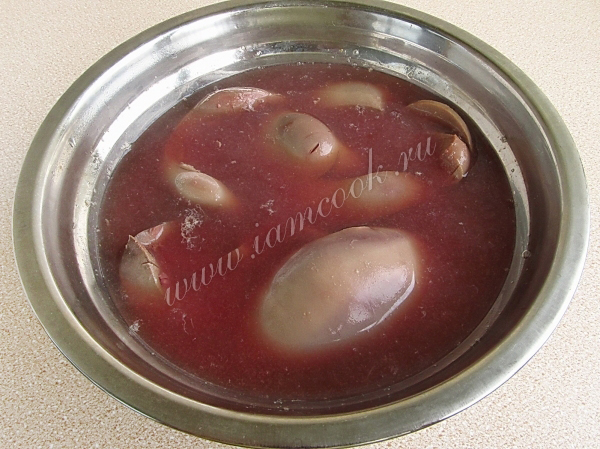 Почки очистить от плёнок и лишнего жира, разрезать пополам, промыть, залить холодной водой и вымачивать в течение 2–3 часов, периодически меняя воду.
