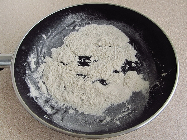 Муку высыпать на сухую сковороду и подсушить, не допуская изменения цвета.