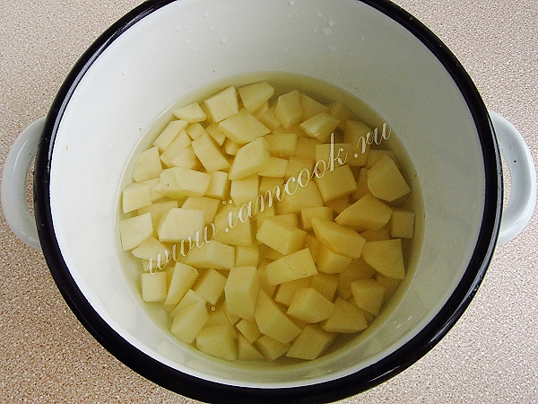 Картофель очистить и нарезать кубиками.