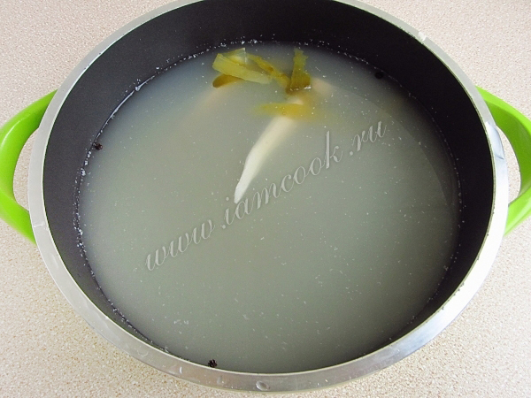 Мясной бульон довести до кипения и положить в него кожицу и сердцевины солёных огурцов, перец и 1 очищенный корень петрушки. Поварить бульон в течение 20 минут, а затем процедить.