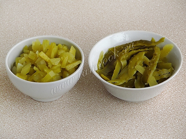 Солёные огурцы очистить от кожицы, разрезать вдоль на 4 части, удалить семена, а мякоть тонко нарезать поперёк. Кожицу и семена не выбрасывать!