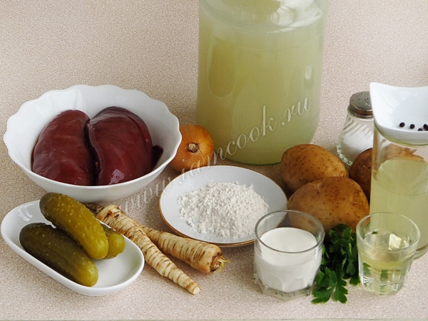 Для приготовления рассольника нужно взять готовый мясной бульон, свиные или говяжьи почки, лук репчатый, солёные огурцы, картофель, муку, масло топлёное, зелень и корень петрушки, перец чёрный горошком, соль, огуречный рассол и сметану.
