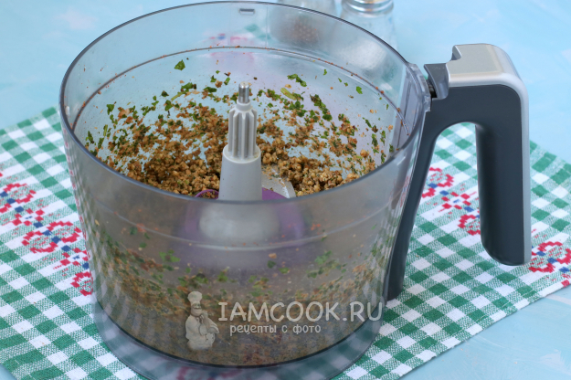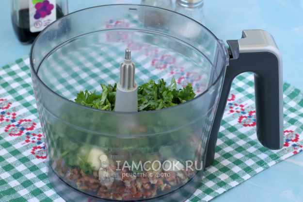 Пока остывают баклажаны, приготовить ореховую заправку. В чашу блендера сложить грецкие орехи, очищенный чеснок, острый молотый перец, кинзу и хмели-сунели. Влить винный уксус.