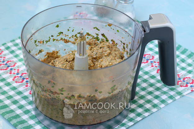 Мякоть можно порубить ножом и смешать с заправкой, а можно добавить мякоть в блендер и пробить до однородной массы. Посолить закуску по вкусу.