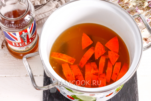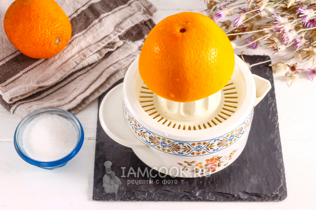 Всыпьте в кастрюлю сахарный песок, влейте апельсиновый сок. Нарежьте ломтиками половинку фрукта и добавьте нарезку в емкость. Если плодов много, то можно один из них нарезать и оставить для подачи.