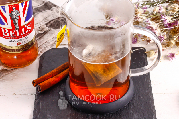 Поместите емкость на плиту, влейте в кастрюлю заваренный черный чай, добавьте корицу. Доведите практически до кипения, желательно до температуры в 70-80 градусов, и влейте алкоголь. Еще раз повторюсь, что он должен быть качественным, иначе плохой суррогат испортит всё послевкусие, да и сам напиток! После вливания виски выключите нагрев.