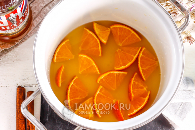 Кипятком ошпарьте апельсины и разрежьте каждый из них пополам. Из трех половинок фруктов выжмите сок, а одну оставьте для добавления в напиток.