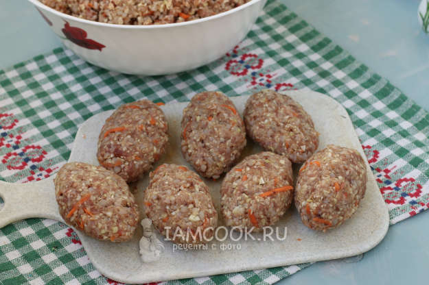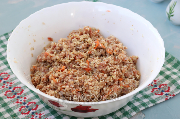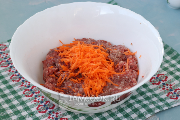 В миску поместить фарш, посолить и поперчить. Добавить к фаршу половину тёртой моркови.