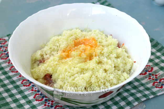 Далее добавить измельчённую капусту с луком, затем яйцо.