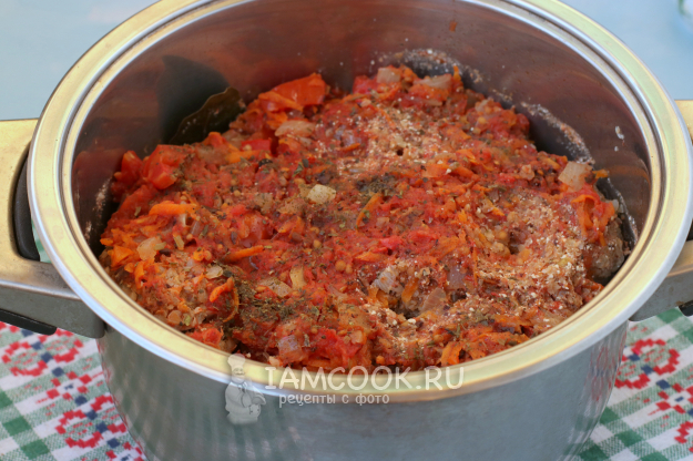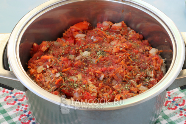 Подливу вылить сверху голубцов, посыпать прованскими травами. Также следует добавить в кастрюлю горячую воду, чтобы общее количество подливы было на 2/3 кастрюли. Добавить в кастрюлю по желанию лавровый лист.