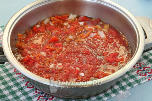 В сковороду, где обжаривались голубцы, добавить 2-3 ст.л. подсолнечного масла, нарезать кубиками оставшийся лук и натереть морковь. Добавить нарезанные кубиком помидоры и томатный сок. Довести подливу до кипения, посолить и поперчить по вкусу. Также можно добавить немного сахара, многое зависит от томатов и сока.