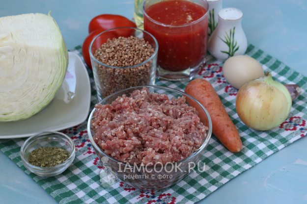 Для приготовления ленивых голубцов с гречкой, капустой и фаршем потребуются следующие ингредиенты.