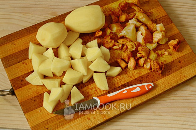 Картошку нарежем некрупными кубиками, лисички разрежем пополам или мельче (мелкие грибы оставляем целыми).