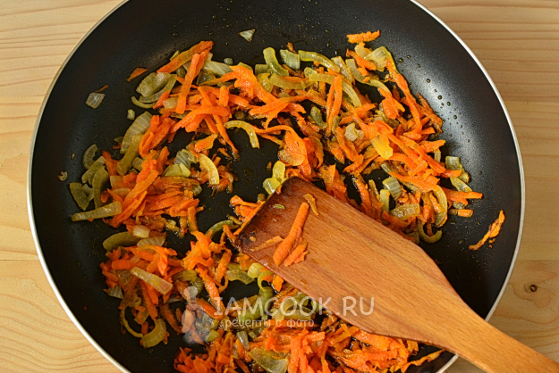 Поджарим до прозрачности лука. Помешиваем.