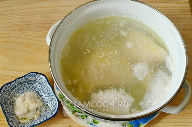 Доводим до кипения, снимаем пену, солим бульон. Варим курицу при слабом кипении под крышкой 15 минут.