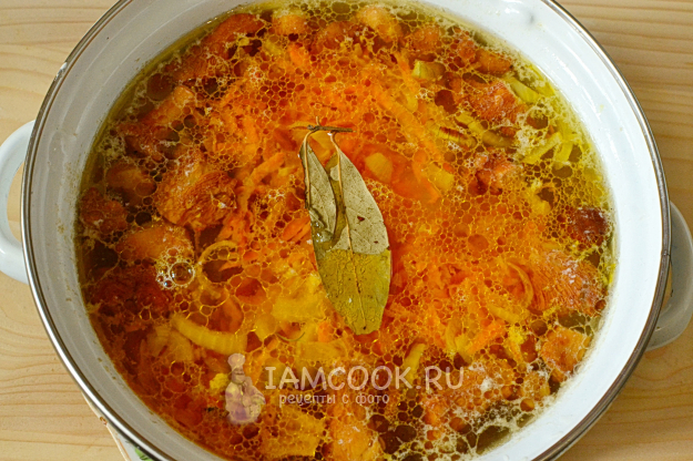 Добавим в суп пассерованные лук и морковь. Поварим еще 10 минут.