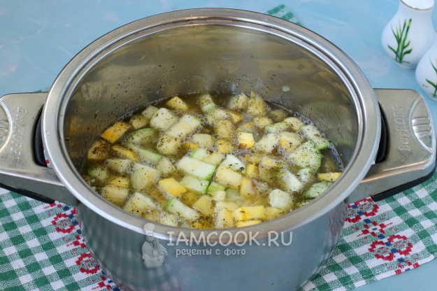 Добавить филе к овощам и варить всё вместе до мягкости кабачков около 15 минут. Пробуем на вкус бульон, теперь уже понятно, нужно ли добавлять соль или её достаточно.