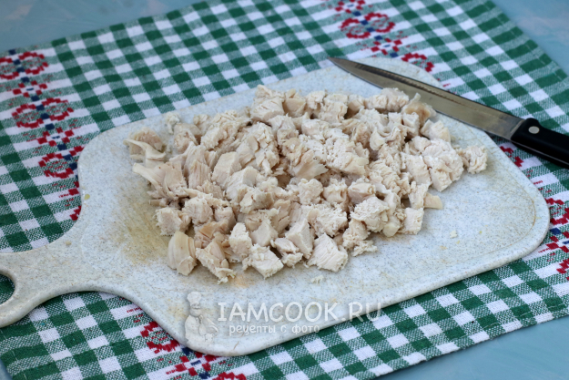 В небольшой кастрюле вскипятить около 700 мл воды. Куриное филе промыть и опустить в кипящую воду. Воду посолить и варить филе до готовности. При варке можно добавить в бульон перец горошком и лавровый лист.