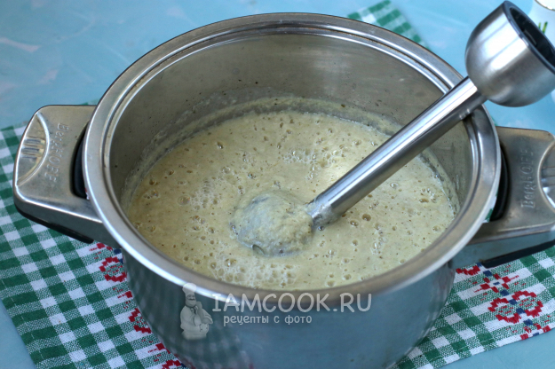 Далее суп следует пробить погружным блендером до однородной консистенции. Я советую не делать это сразу, а оставить суп под закрытой крышкой на 30 минут, чтобы не обжечься горячим супом. За это время можно самостоятельно приготовить сухарики. Я просто нарезаю кубиками хлеб и подсушиваю на сухой сковороде со всех сторон.