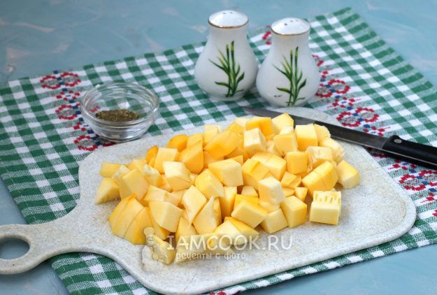 Кабачок вымыть, почистить и удалить семена, если они имеются. Молоденькие кабачки можно использовать вместе с кожицей. Кабачок также нарезать кубиками.