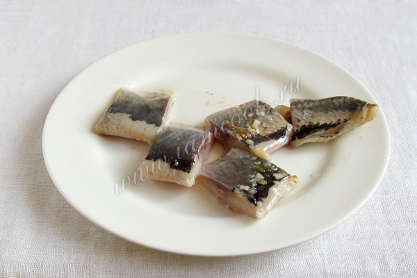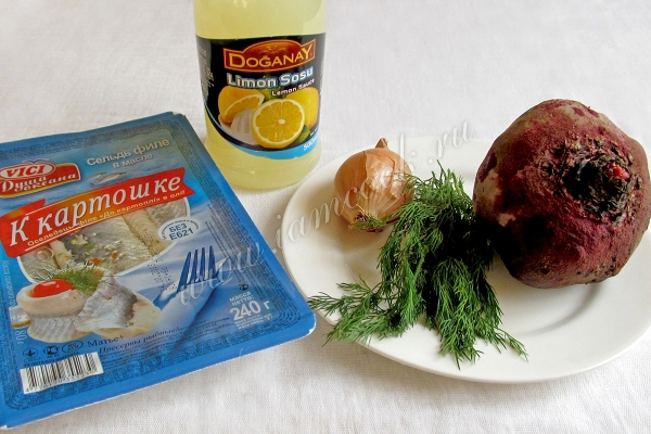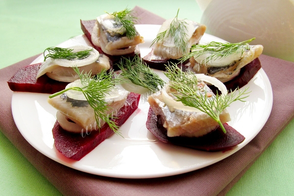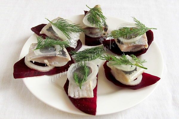 На блюдо выложить нарезанные ломтики свеклы, сверху - колечки лука, затем - кусочки сельди, и снова- колечки лука. Украсить укропом и подавать