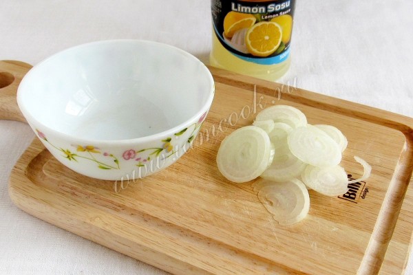 Лук очистить и нарезать кольцами. залить лимонным соком и оставить на 10 минут мариноваться.