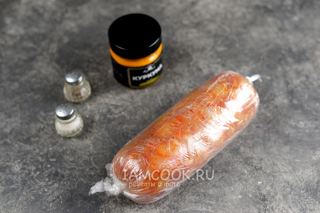 Сформируйте из мяса рулет, замотайте его в несколько слоев, чтобы во время приготовления пленка не порвалась.
