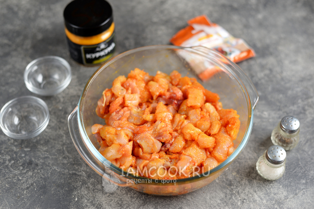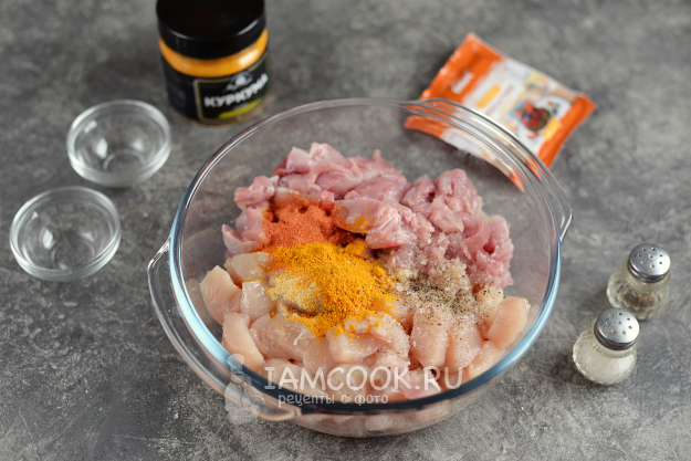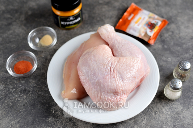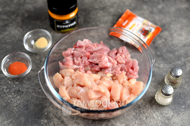 Добавьте соль и перец по вкусу, всыпьте приправу для птицы и куркуму. Вместо приправы можно взять паприку, если любите.