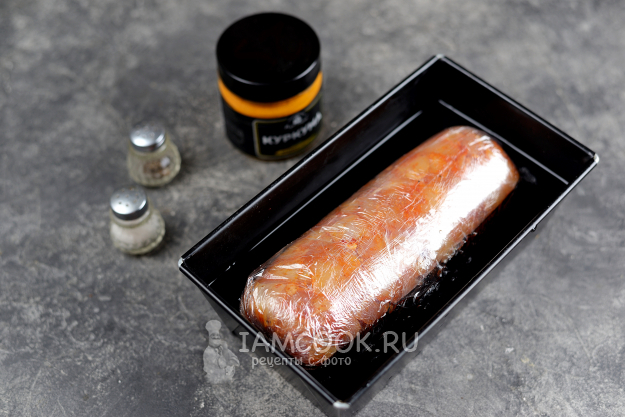 Для приготовления мраморного рулета из курицы с желатином я взяла форму для хлеба длиной 20 сантиметров, вы же берите любую подходящую. Выложите в форму заготовку, залейте ее водой практически полностью. Отправьте в предварительно разогретую до 180 градусов духовку на 40 минут. Спустя время рулет нужно извлечь из формы и остудить полностью в холодильнике.