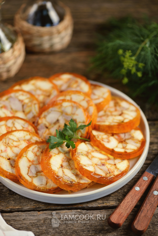 Чтобы желатин распределился равномерно по внешнему кругу рулета, я поставила его на торцевую сторону и оставила в холодильнике на сутки. Застывший рулет нарежьте кружочками толщиной около 1 сантиметра и подавайте к столу.
