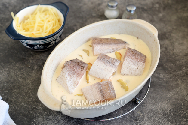 Когда картофель будет полуготовый, выньте форму из духовки, быстро выложите на нее куски рыбы, вылейте заливку из яиц и сливок.