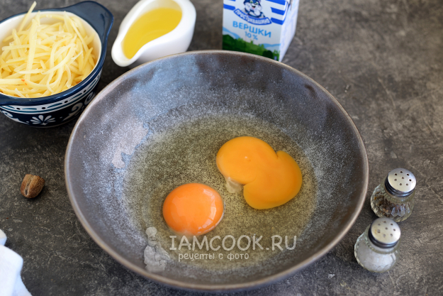 Пока картофель запекается, приготовьте заливку. Для этого в глубокую миску вбейте свежие куриные яйца.