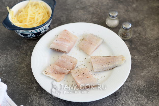 Рыбу нарежьте на куски, ее также слегка посолите и поперчите.