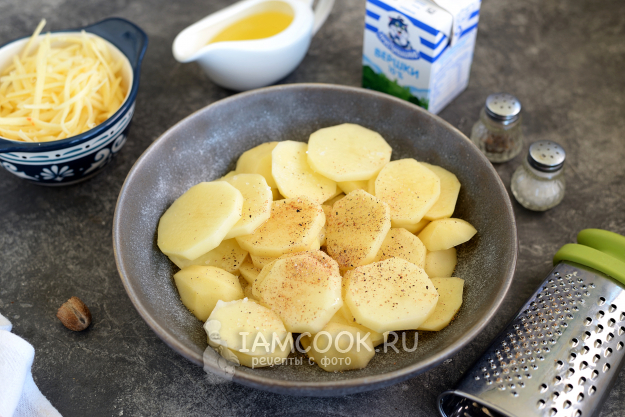 Нарежьте картофель тонкими кружочками, толщиной 3-4 миллиметра, сложите в глубокую миску, добавьте соль и перец по вкусу, а также щепоть натертого на самой мелкой терке мускатного ореха. Влейте совсем немного растительного масла, хорошенько перемешайте, чтобы все ломтики были покрыты специями и маслом.