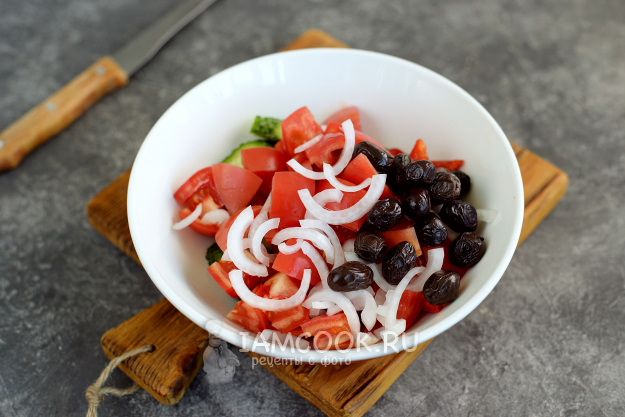 Спелые и сочные помидоры нарежьте крупными кубиками, сладкий салатный лук - полукольцами, добавьте все в миску вместе с маслинами.