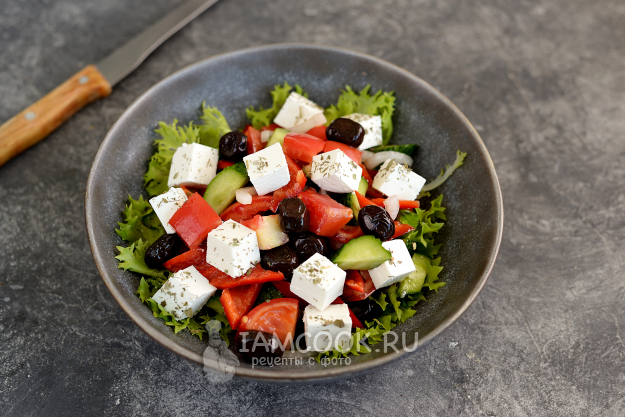 Греческий салат удобнее всего подавать в глубокой миске. На дно положите салат латук, который нужно слегка порвать руками, на него выложите заправленные овощи.