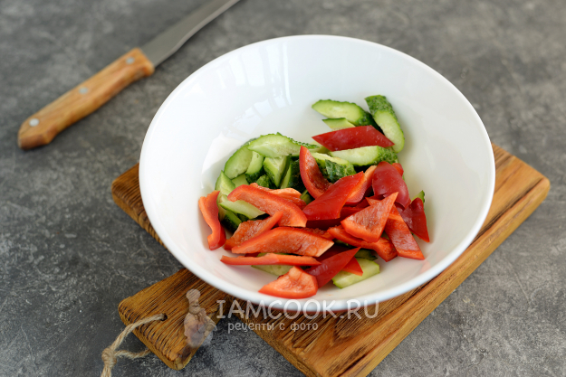 Обрежьте огурцы с обеих сторон, очистите перец от семечек и плодоножки, нарежьте овощи достаточно крупными кусочками.