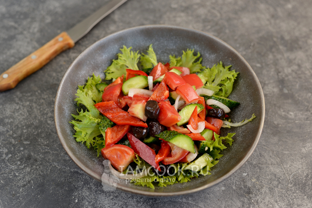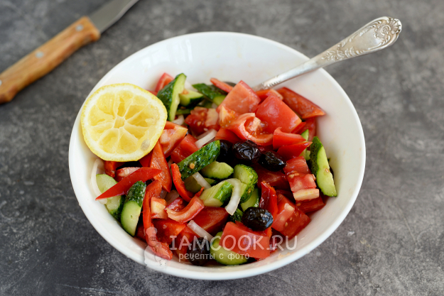 Заправьте салат маслом и лимонным соком, перемешайте. Соль, скорее всего, не понадобится, поскольку маслины и фета достаточно соленые.
