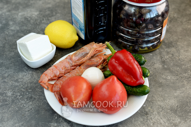 Подготовьте необходимые продукты для греческого салата с креветками. Креветок заранее разморозьте. Помойте и обсушите овощи.