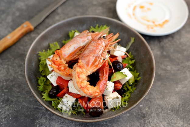 Вкусный, ароматный и полезный греческий салат с креветками готов к подаче.