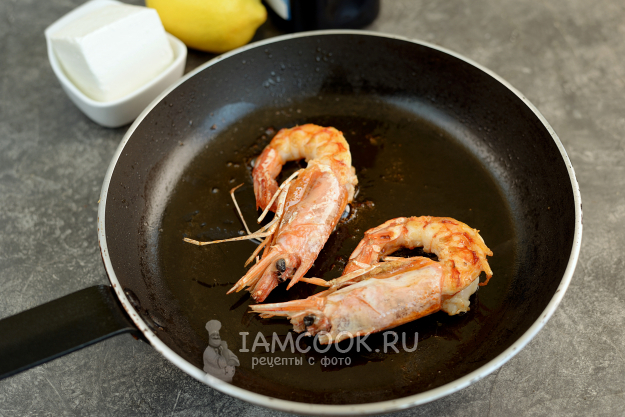 Креветки нужно аккуратно почистить, но только хвосты, при этом голова и хитиновый кончик хвоста остаются для красоты. Быстро обжарьте их в минимальном количестве растительного масла с обеих сторон.