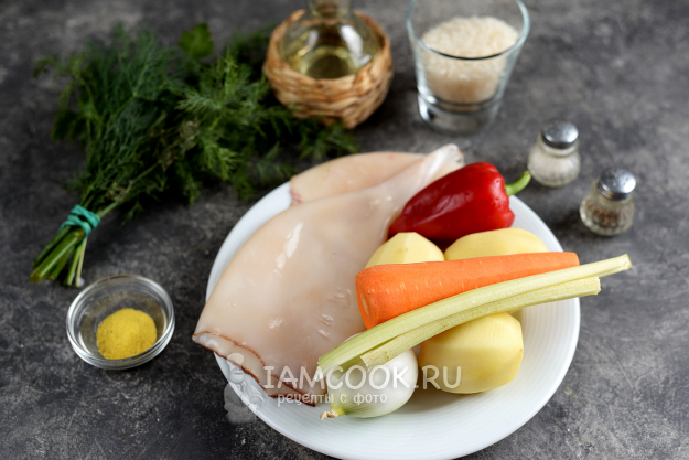 Подготовьте продукты для супа с кальмаром. Овощи почистите, помойте вместе с зеленью под проточной водой. Кальмара также нужно очистить от оставшихся внутренностей, снять пленки, тщательно промыть.