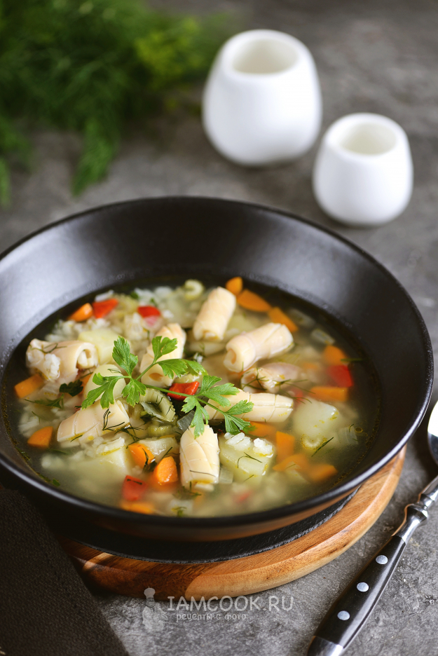 Вкусный, полезный и малокалорийный суп с кальмаром готов.
